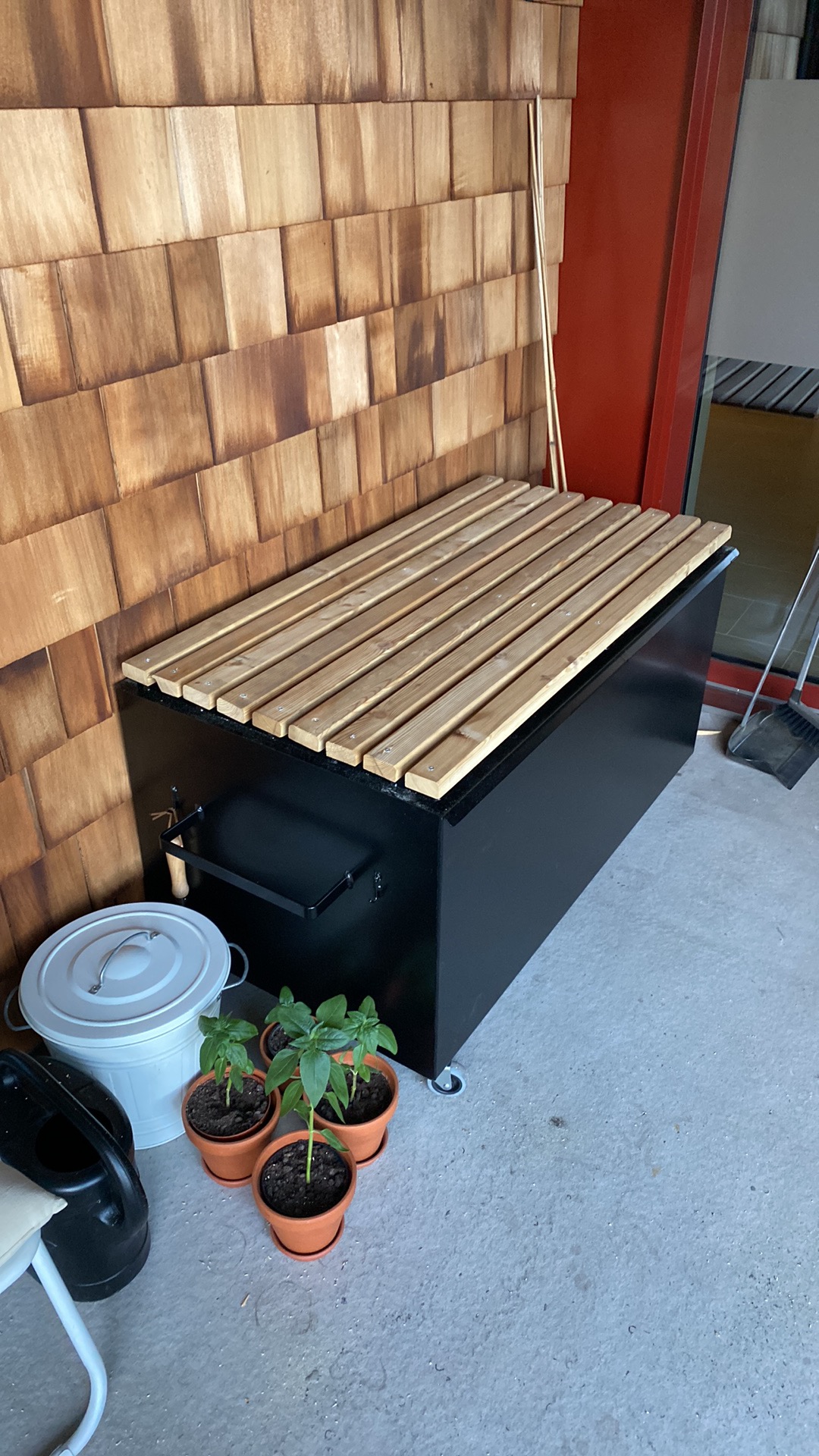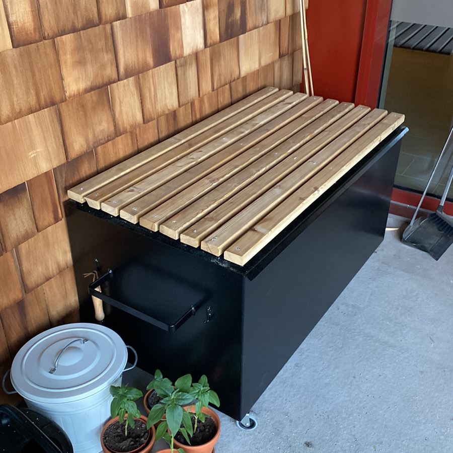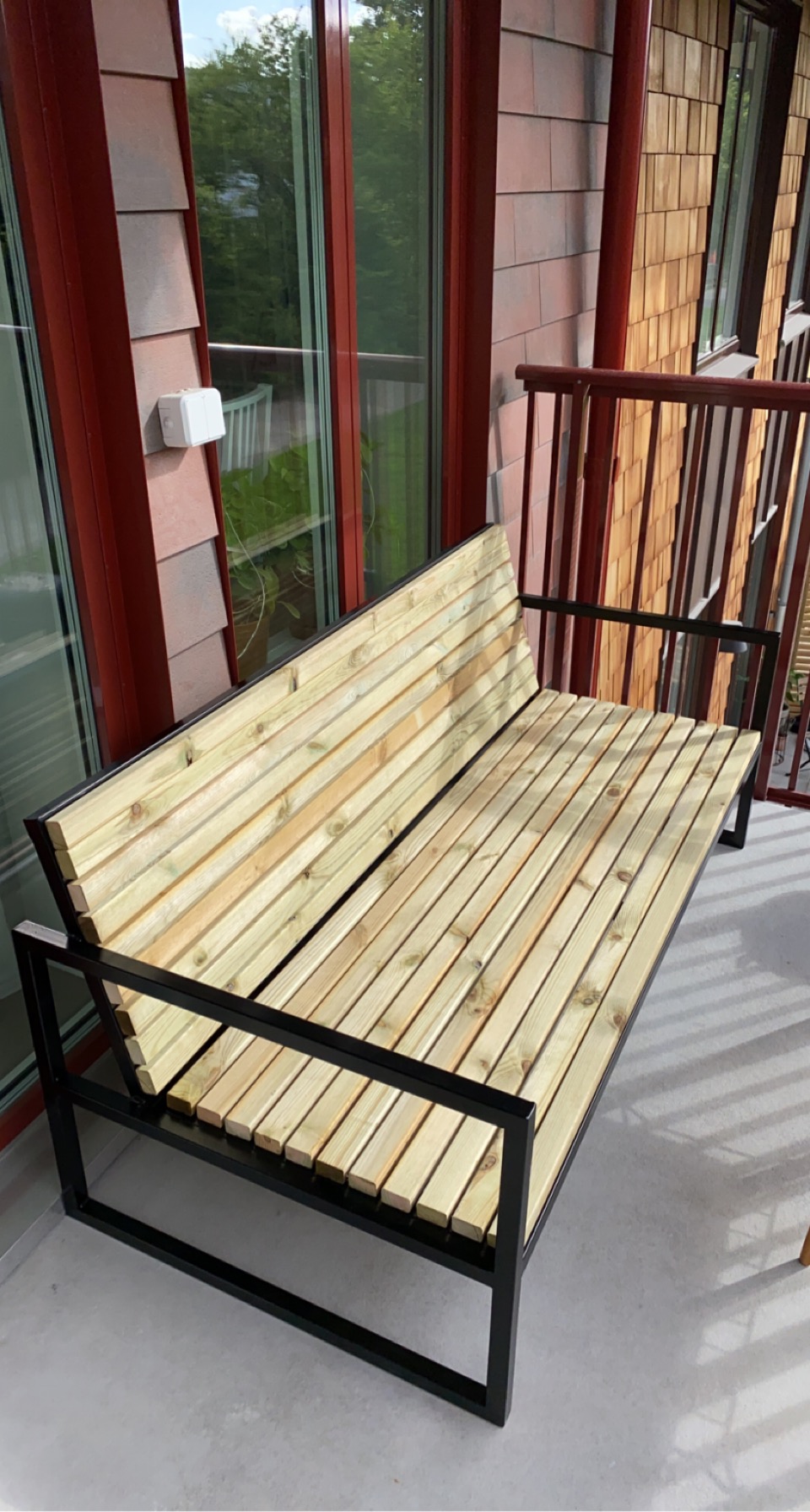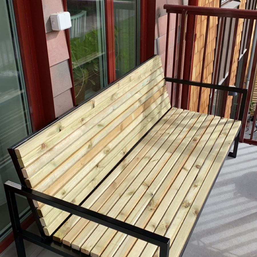Designat bänk i 5 mm cortenplåt eller varmförzinkad plåt. Urtag för tre stycken standardplank 120x45. Kundanpassad längd.